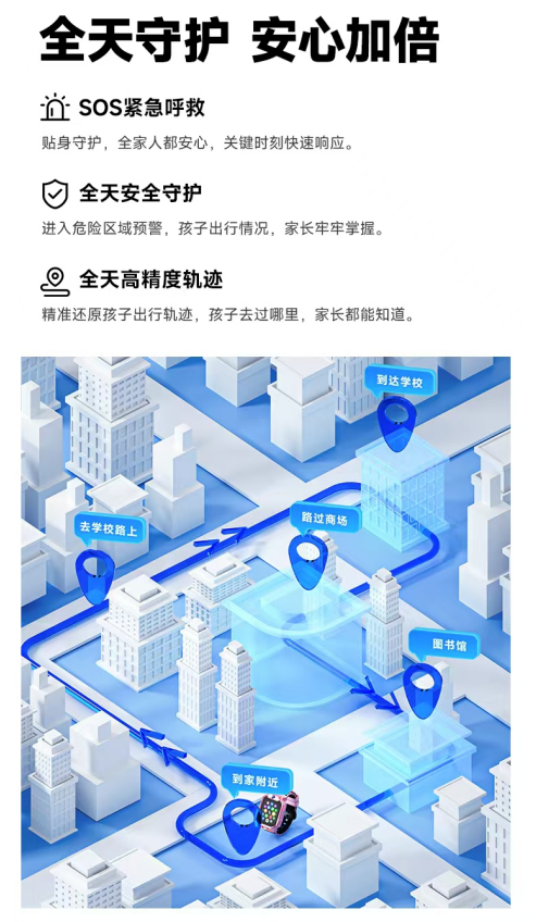 此外,产品延续安全与便捷属性,搭载 GPS 定位功能保障出行安全,支持儿童版社交应用满足沟通需求,同时覆盖运动模式、防水性能等配置,全方位贴合儿童日常使用场景。