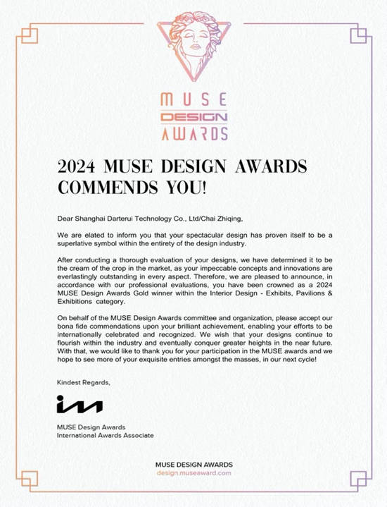 2024年获 美国USA MUSE DESGIN AWARDS-GOLD WINNER 2024 INTERIOR DESGIN-Pavilions & Exhibitions