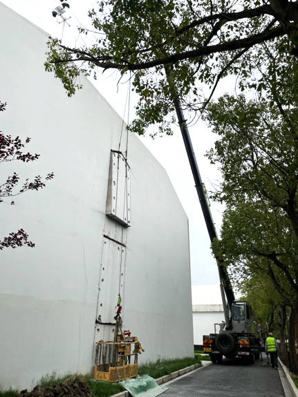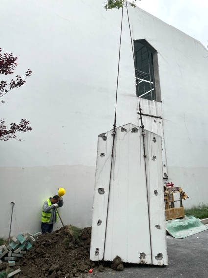 柴之清:在高空整体切割、大型机械吊运的砖砌墙体重约2000KG!当初的灵感来自于埃及金字塔整体切割搬迁的历史性事件,幸运的是当即获得了香地艺术中心的高度认可才得以在短短的2周完成了设计-艺术的同频在地创作实现。在“YU见”中既保留了机械切割的物质性特征、切割机轨的固定锚点,以虚实置换、能量守衡的文献性工程记录,与艺术共同叙述人类建构的历史性“YU见”。香地艺术中心的尖穹形态落地与各楼形象基因遥相呼应,艺术性镌刻“YU见”见证历史。