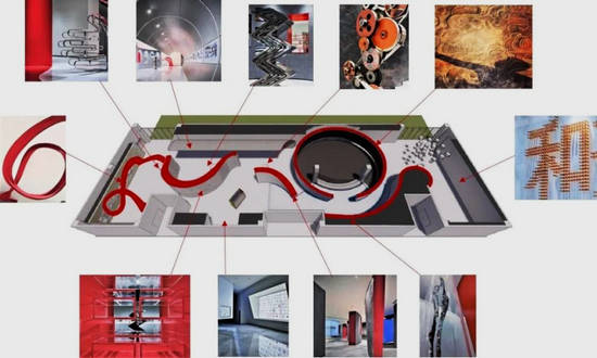 以中华经典传统文化“书卷”的象征元素为叙事载体,逐一展开、高潮迭起,将展陈的故事化陈列、艺术化演绎、体验化观展。强烈的中华红主线“长卷”、模数化的烟盒“砌块”,象征着中华品牌精细制造、严谨管理和百年民族品牌企业源源流长的文化精神。
